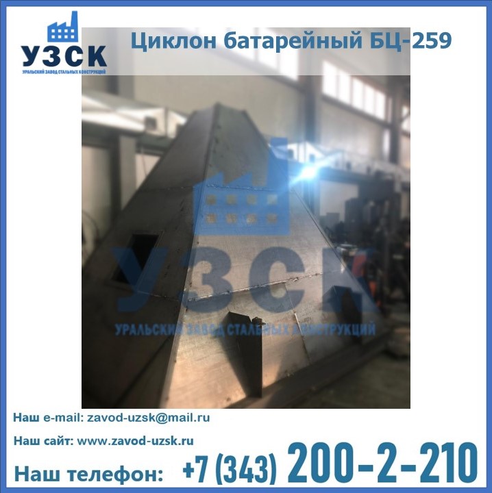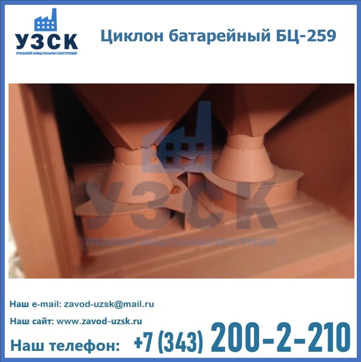 Батарейные циклоны модели БЦ-259 конструируются из нескольких металлических труб (выхлопных отводов), диаметр которых составляет около 26, 9 см. Элементы устанавливаются в параллельной плоскости и объединены корпусом с общей подводкой. Такие трубы предназначены для выхлопа и состоят из специальных заворачивающих лопаток, решетчатых элементов и опорных стоек футляра. Основную наружную панель оснащают патрубком для соединения и вибробункером, помимо этого, на панели устанавливают теплоизоляцию.