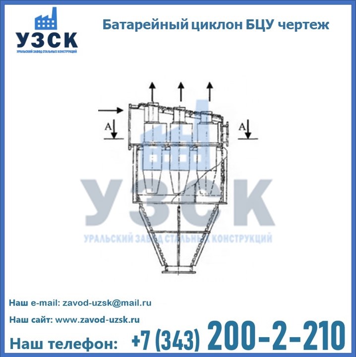 Батарейный циклон-золоуловитель БЦУ представляет собой сварную металлическую конструкцию, которая состоит из нескольких циклонов, заключенных в общим корпус/кожух. Также, аппарат оснащен общими коллекторами отвода и подвода газов для дальнейшей фильтрации, а также накопительным бункером для сухой твердой золы.